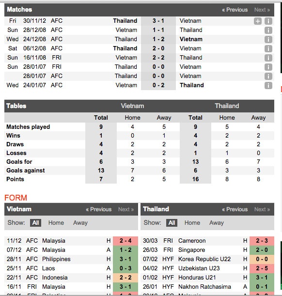 | Thống kê cụ thể những lần đối đầu giữa ĐTVN và Thái Lan thời gian gần đây. |