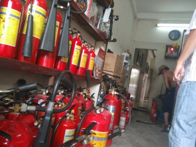 Trong khi đó tại cửa hàng thiết bị phòng cháy chữa cháy M.T trên đường 3 Tháng 2, quận 11, chủ cửa hàng cũng cho biết nơi đây tân trang hàng loạt bình loại lớn, nhỏ. Tại cổng ra vào, một nhân viên cơ sở dùng dao kỳ cọ những bình chữa cháy tróc vảy ra để sơn lên một màu đỏ y như bình mới.