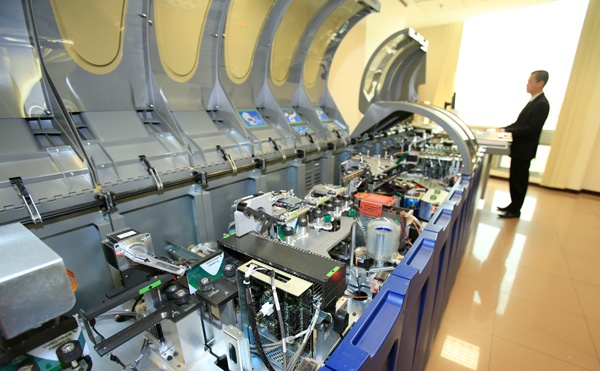 Thu hút sự chú ý của khách hơn cả tiếng ầm ào vọng ra từ căn phòng bên tay trái phía trong. Lọt vào trong đó, chỉ tay vào khối máy lớn hơn trông như suốt những con thoi dệt, bà Nguyễn Thanh Hằng, giám đốc Trung tâm thẻ cho hay đây là máy dập thẻ mới nhập về được xem là hiện đại nhất trong khối thẻ các ngân hàng.