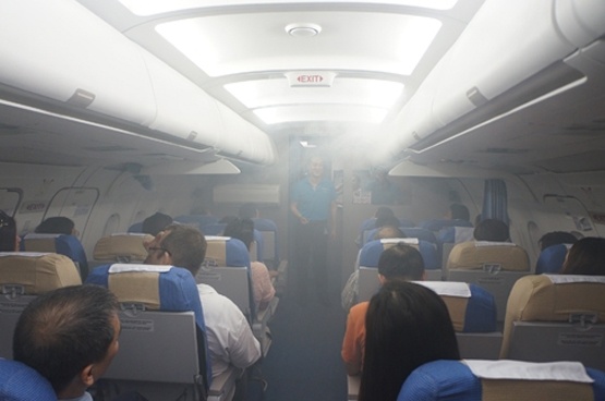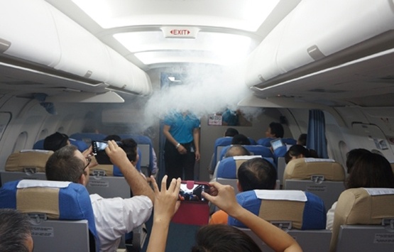 | Phi công, tiếp viên ứng phó trước tình huống máy bay xì khói trong khoang hành khách. |