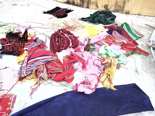 Nhiều tấm vải trang trí gần giống thổ cẩm của đồng bào vùng cao rơi cùng "vật thể lạ". |
