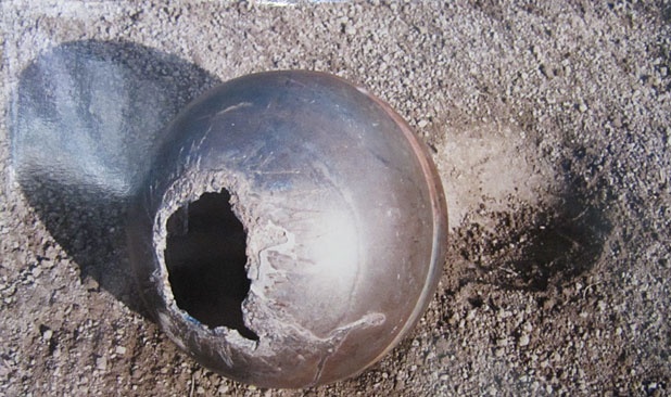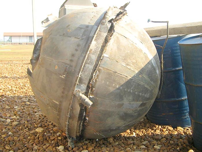 | Một quả "cầu không gian" Space Ball khác được tìm thấy ở Belem, Brazil năm 2006. Đây là một phần của vệ tinh TelStar 402. Nó có đường kính khoảng 80 cm và chiều cao khoảng 1 m. |