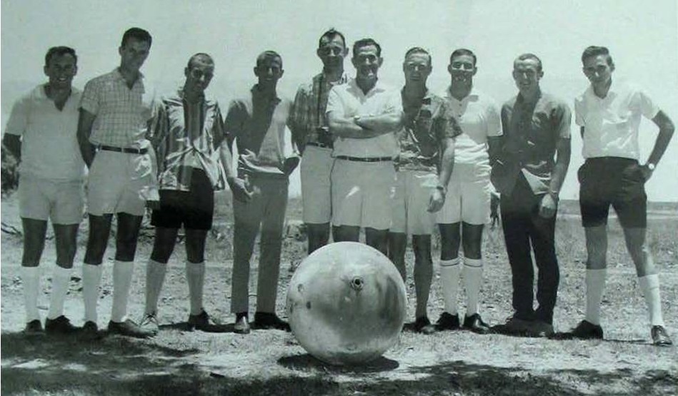 | Một nhóm các nhà khoa học Australia chụp ảnh bên cạnh một Space Ball rơi xuống nước này năm 1968. |