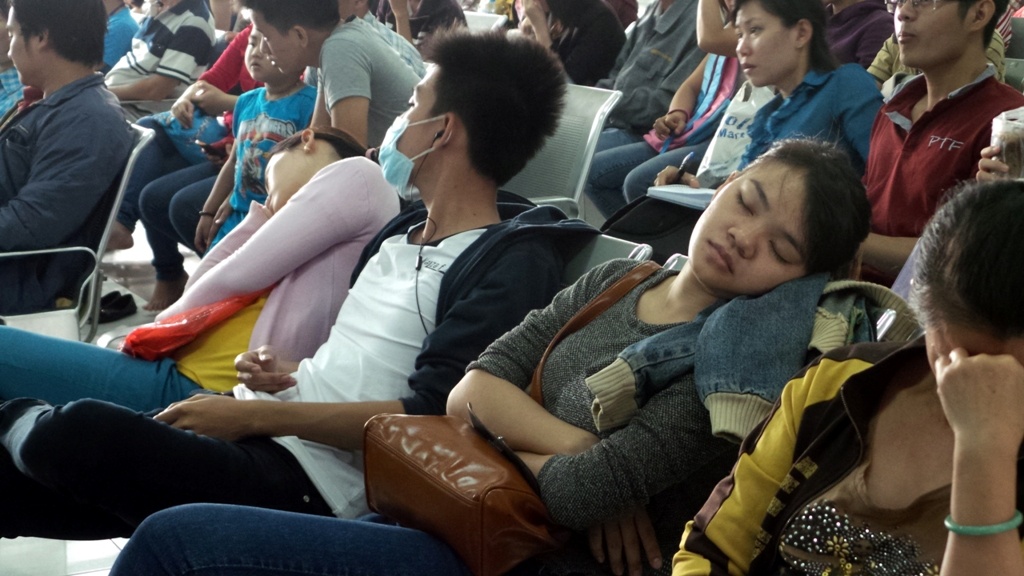 Nhiều người dân đến ga Sài Gòn vào lúc sáng sớm chờ mua vé tàu tết đã rất mệt mỏi và ngủ gục trong lúc chờ đợi đến lượt mua vé tàu về quê trong dịp tết Ất Mùi 2015.