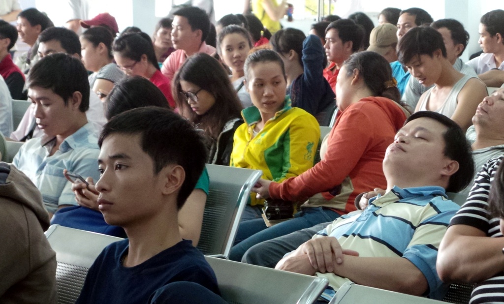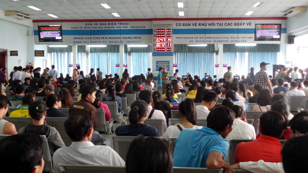 | Khu vực bán vé được tổ chức trên lầu 1. Số lượng hành khách đổ về tăng đột biến, ngồi kín hàng trăm ghế chờ của nhà ga nên nhưng người lên sau không còn chỗ, phải ngồi xuống nền nhà để chờ đợi. |