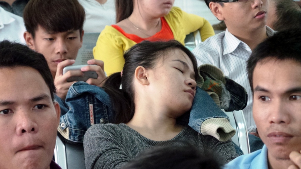 | Một phụ nữ trung niên tranh thủ chợp mắt lấy sức trong khi những người khác chờ đợi trong sự căn thẳng để đến lượt mình. Ga Sài Gòn cho biết, mỗi ngày sẽ phát 1.000 số thứ tự cho khách và được giải quyết mua vé trong ngày. Tuy nhiên nhiều người có số thứ tự trên 1.000 vẫn cố nán lại với hy vọng mua được vé. |