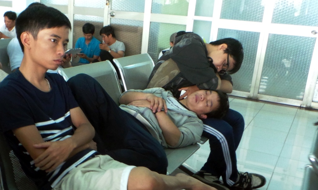 | Nhiều bạn trẻ đến ga từ rất sớm và chờ đợi liên tục nhiều giờ để mua vé nên rất mệt mỏi. Nhóm ba bạn trẻ này đã chờ hơn 4 tiếng đồng hồ (từ 6h đến 10h) nên mệt mỏi ngủ thiếp đi. |