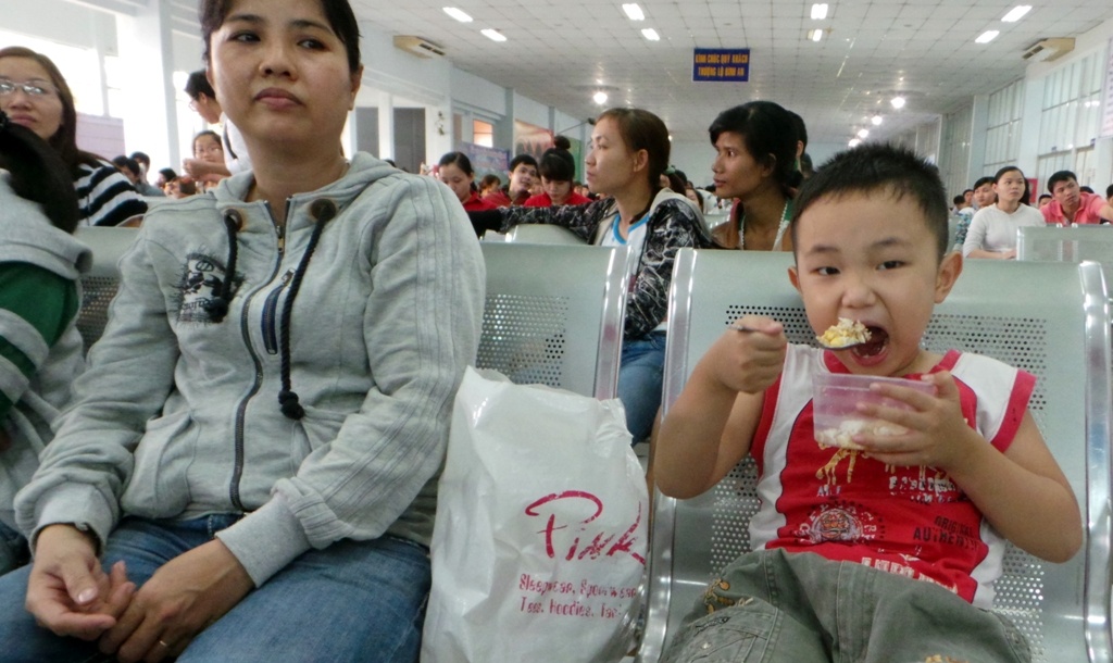 | Bé trai theo mẹ đi mua vé tàu. Người mẹ chuẩn bị sẵn cơm mang theo cho bé ăn trưa tại nhà ga trong lúc chờ đến lượt. |