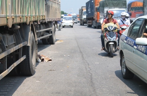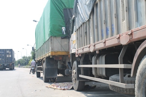 | Thi thể nạn nhân nằm giữa 2 chiếc xe tải lớn. |