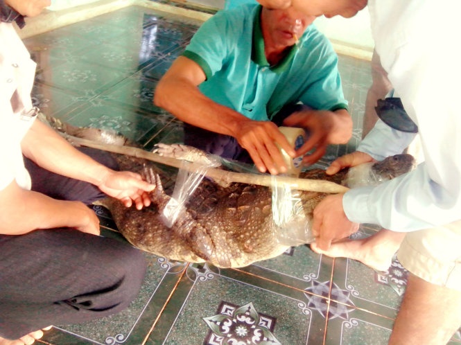 Sau khi bủa vây được cá, kiểm lâm đã dùng nhiều dụng cụ để khống chế. Kiểm lâm cho hay đây là cá sấu Xiêm, dài khoảng 2 m, nặng 32 kg.
