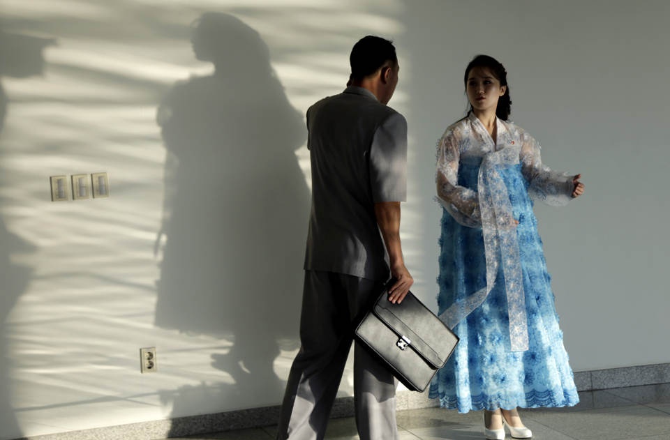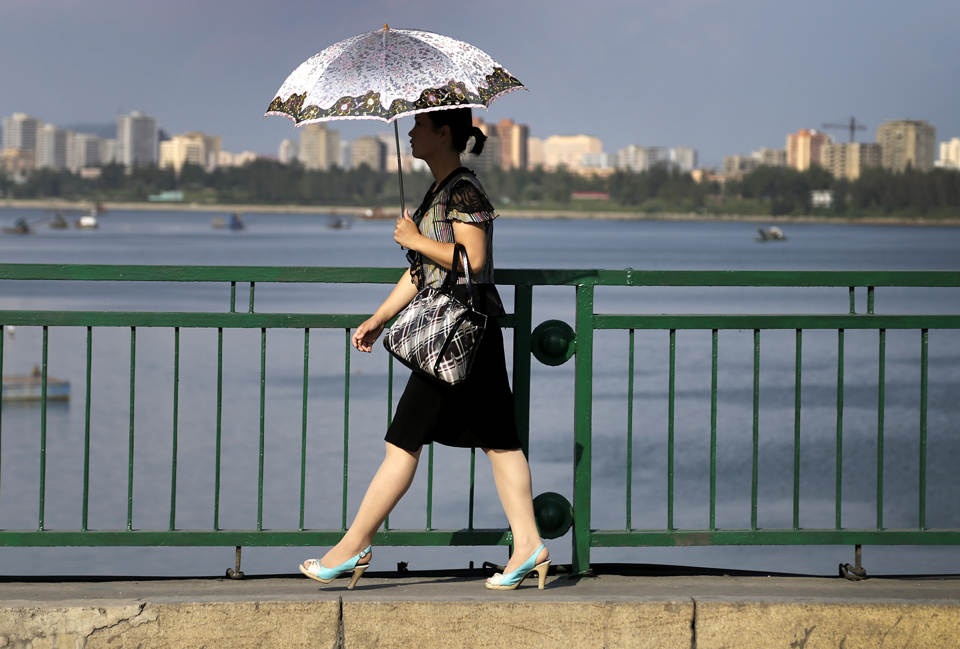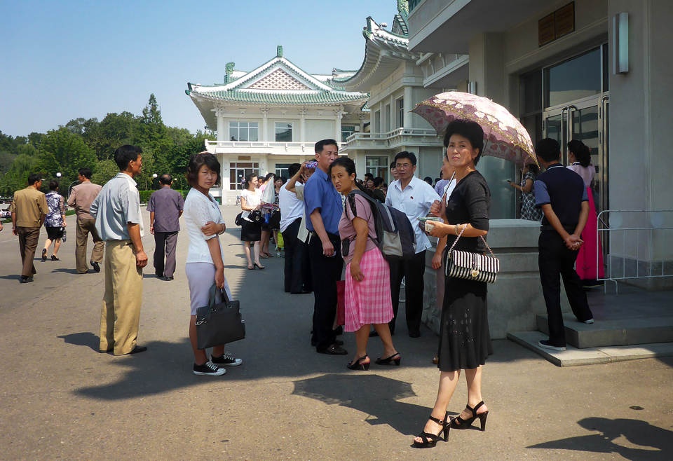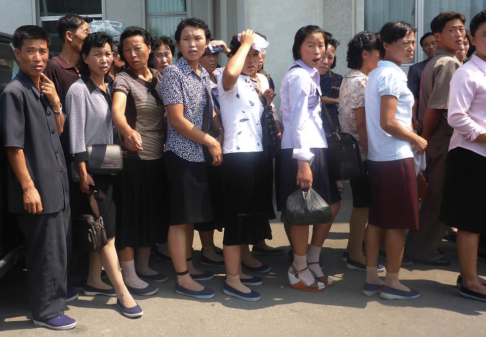 Chỉ một cô gái đeo giày cao gót giữa hàng người ở Bình Nhưỡng.