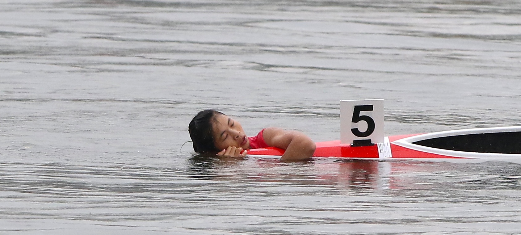 | Sau khi cán đích ở vị trí đầu tiên, Trương Thị Phương gặp sự cố. Thuyền của cô mất thăng bằng và bị lật. |