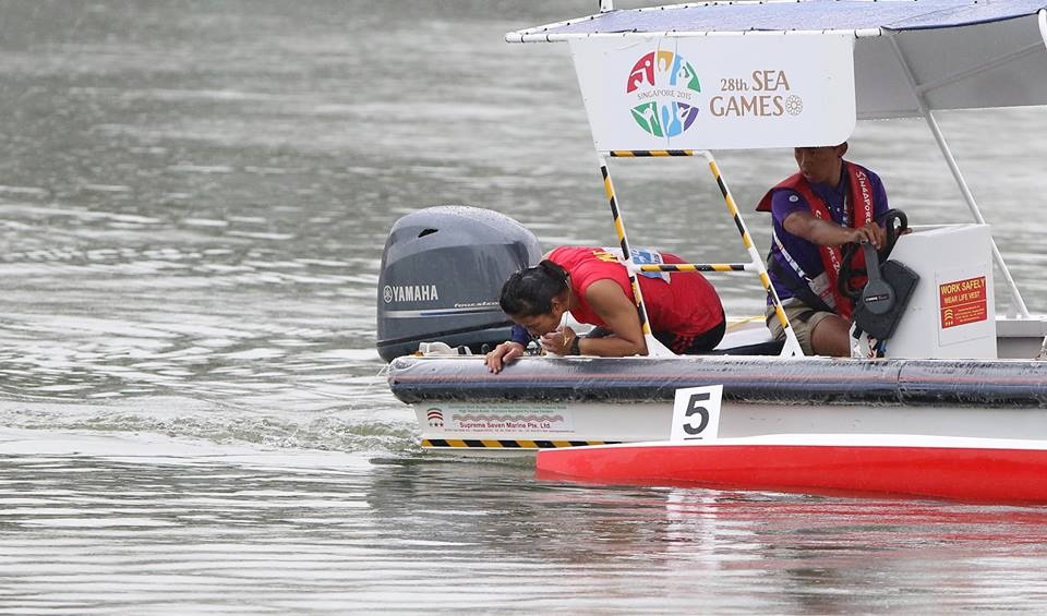 | Kiệt sức vì nỗ lực về đích mang vinh quang về cho Tổ quốc, VĐV của Việt Nam bám vào thuyền và chờ cứu hộ tới trợ giúp. |