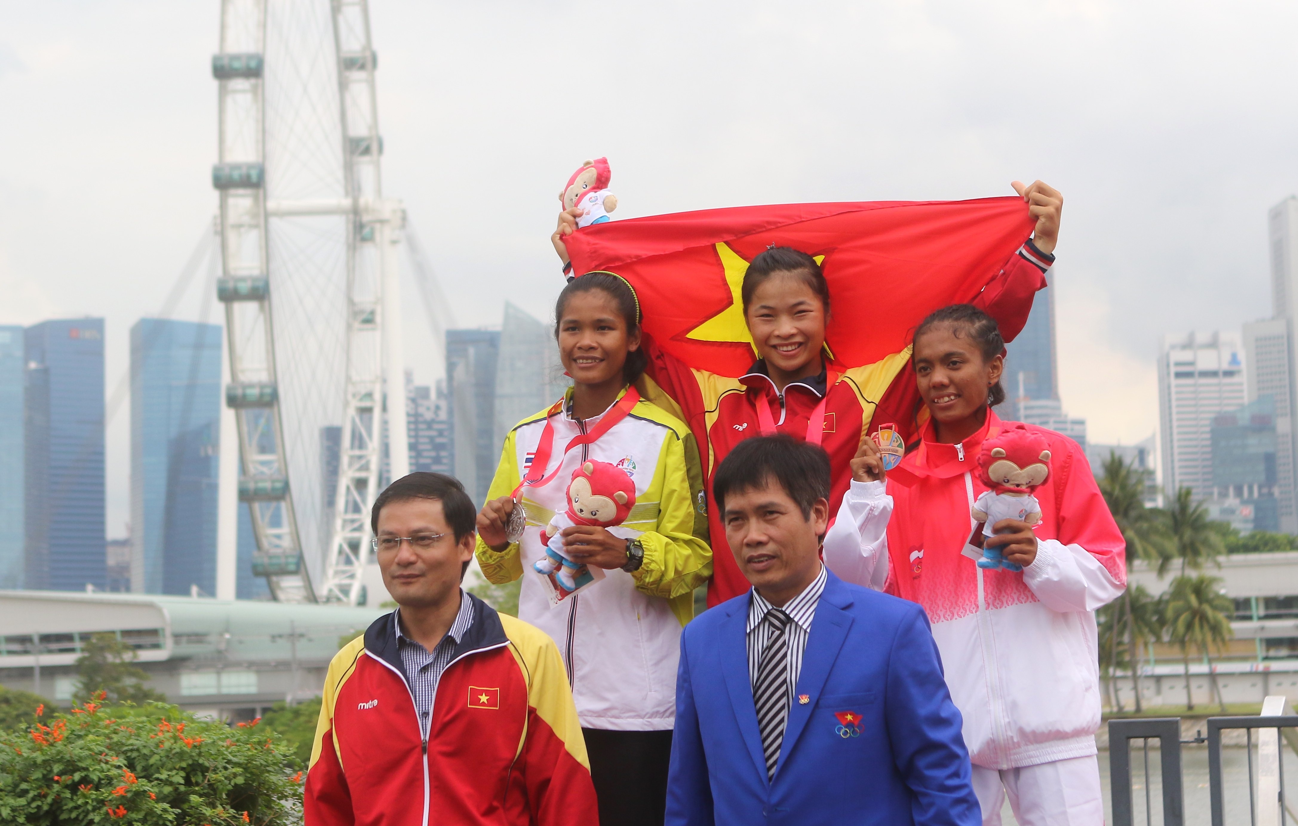 | Trương Thị Phương giơ cao lá cờ đỏ sao vàng trên bục nhận huy chương. Trưởng đoàn Thể thao Việt Nam tại SEA Games 28 - ông Trần Đức Phấn có mặt để chúc mừng nữ vận động viên mang về chiếc huy chương vàng duy nhất cho canoeing nước nhà tại Đại hội trên đất Singapore. |