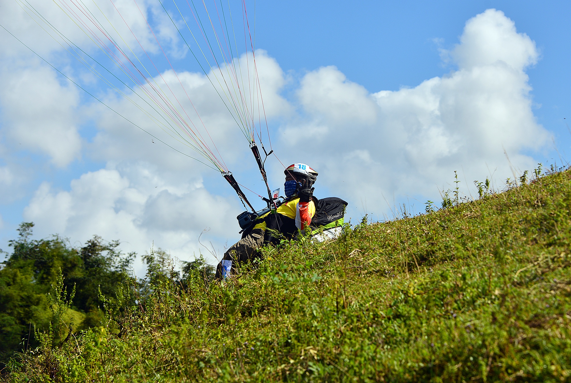 Vận động viên Trần Hùng Thắng (đoàn Viet Wings) mới chạy đà được vài bước dù đã cuốn vào nhau nên phải bay lại.