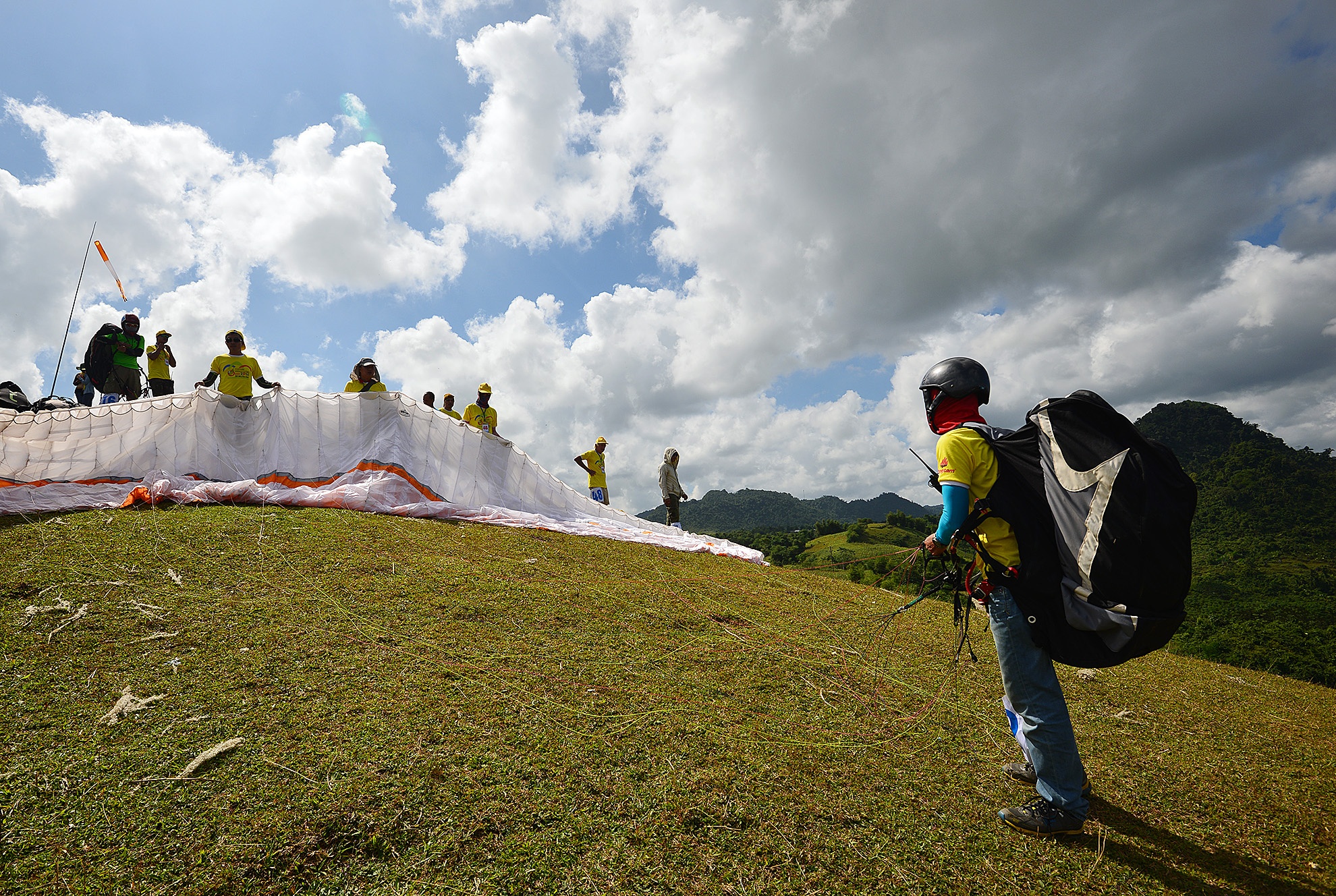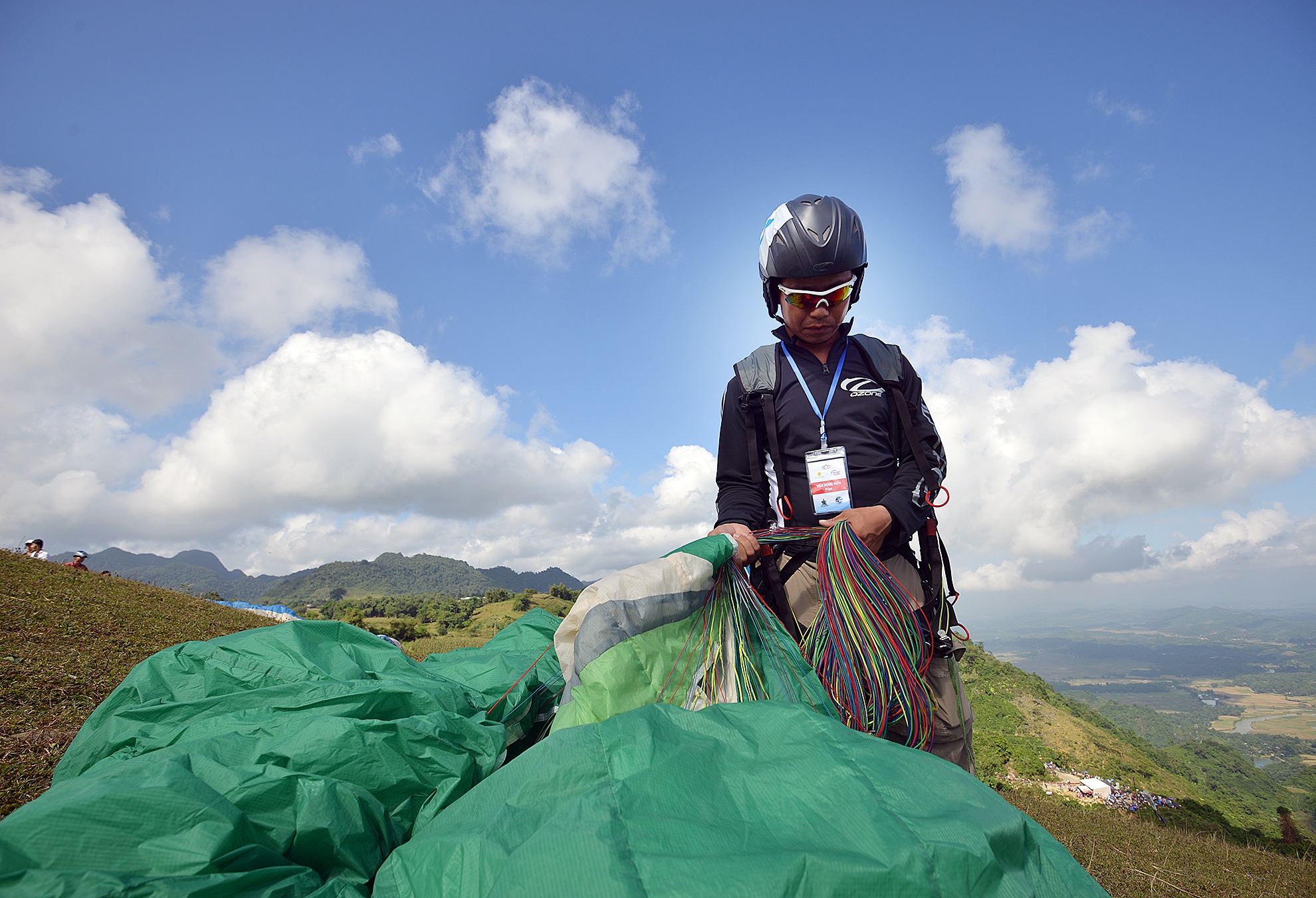 Vận động viên Cấn Mạnh Hùng (đoàn TP.HCM) chuẩn bị cho lượt bay đầu tiên. Ban đầu thời tiết không ủng hộ nên hầu hết các vận động viên phải phơi nắng 6 tiếng khiến nhiều người mệt mỏi.