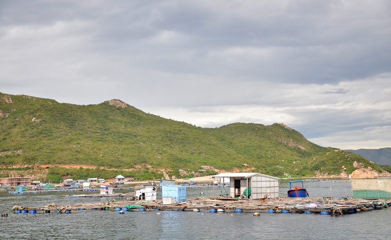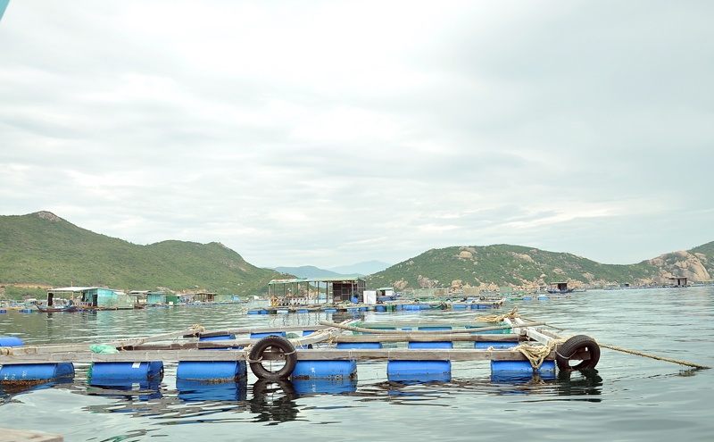 | Những bè nuôi các loại hải sản, đặc biệt tôm hùm chủ yếu ở bãi trước, khu vực cầu cảng Bình Ba. |