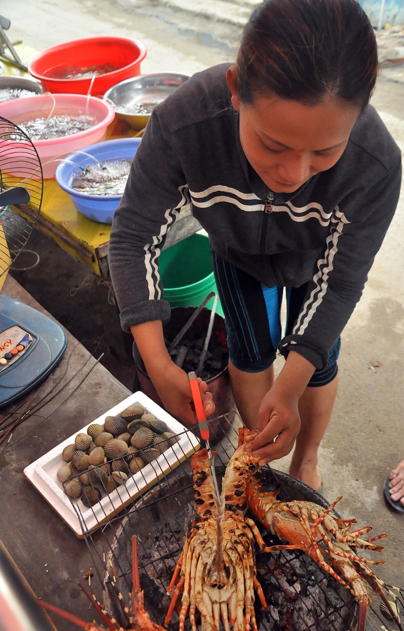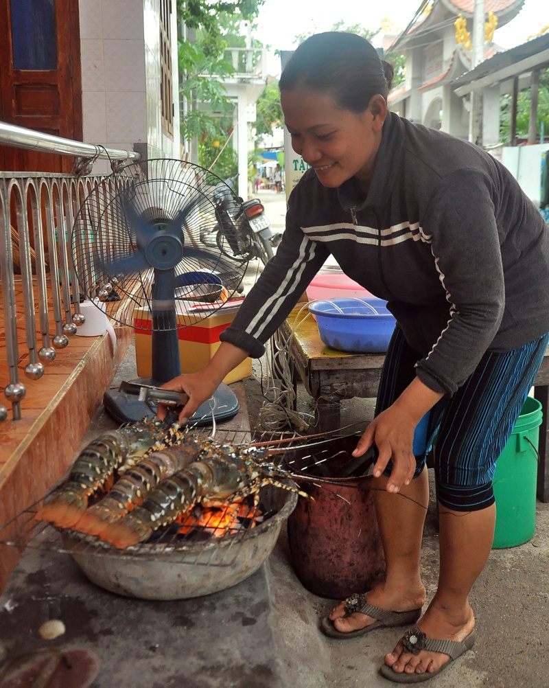 Chọn cho mình 3 con tôm hùm 2kg chúng tôi được chị Tân trực tiếp chế biến với món tôm hùm nướng. Khi lò than được quạt rực hồng, những con tôm hùm từ màu xanh chuyển sang màu đỏ ngói trông vô cùng bắt mắt. Vì mình tôm khá dày nên các chủ quán thường cắt dọc đôi con tôm để nướng cho chín đều. Nếu muốn thêm vị béo, du khách có thể yêu cầu chủ nhà thêm một chút phơ mai, hoặc bơ phết đều lên phần thịt tôm.