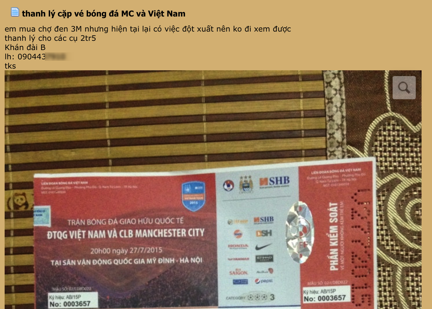 Trên các diễn đàn mua bán online, nhiều thành viên đăng bài bán vé xem trận ĐT Việt Nam - Man City với giá gốc, thậm chí chịu lỗ vài trăm nghìn đồng.