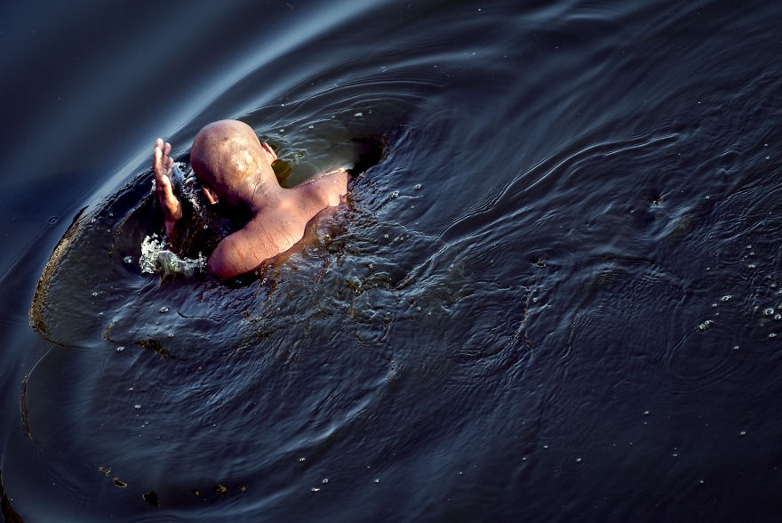 | Một nhà sư đang đắm mình trong làn nước ở Mandalay, Myanmar. |