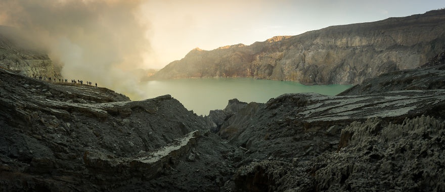 | Nằm ở Đông Java, Indonesia, hồ Ijen nằm trên núi lửa Ijen có màu xanh ám ảnh. Nước hồ rất độc do có chứa axit. Đây cũng là nơi khai thác lưu huỳnh.