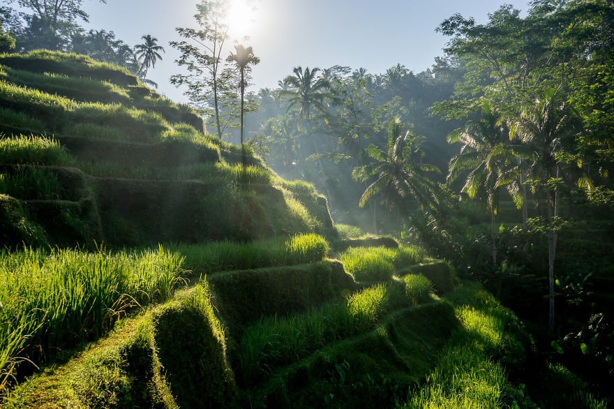 | Ruộng bậc thang xanh mướt trong ánh mặt trời ở Bali, điểm tham quan nghỉ dưỡng nổi tiếng thế giới của Indonesia. Vùng đất này không chỉ có cảnh đẹp mà còn ghi điểm bởi nền văn hóa độc đáo, ẩm thực tươi ngon và các spa tuyệt hảo. |