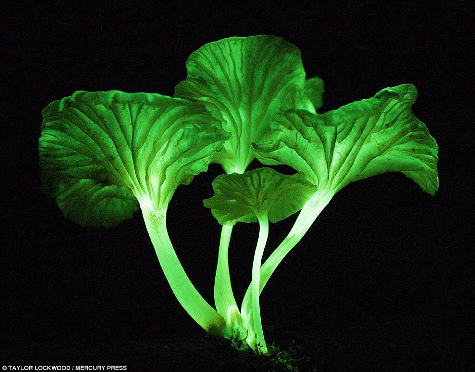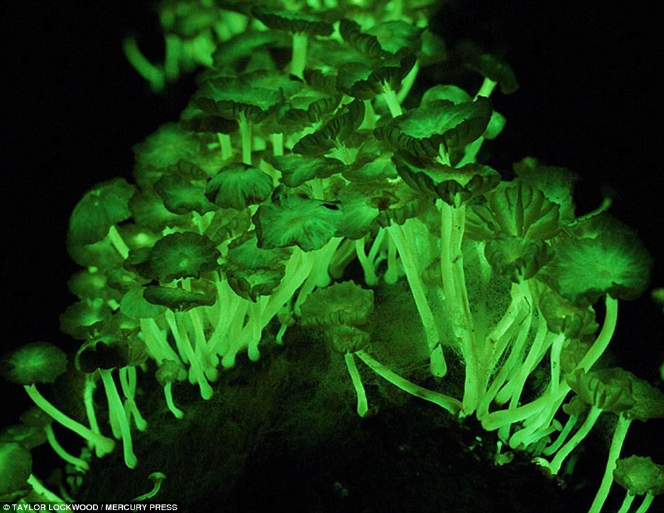 | Ánh sáng từ cây nấm phát sinh do phản ứng hóa học giữa luciferin - một hợp chất chất phát quang - và luciferase, một loại enzyme. Phản ứng đó cũng xảy ra trong một số loài động vật như mực, sứa, bọ cạp. |