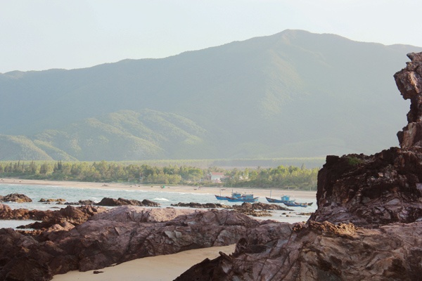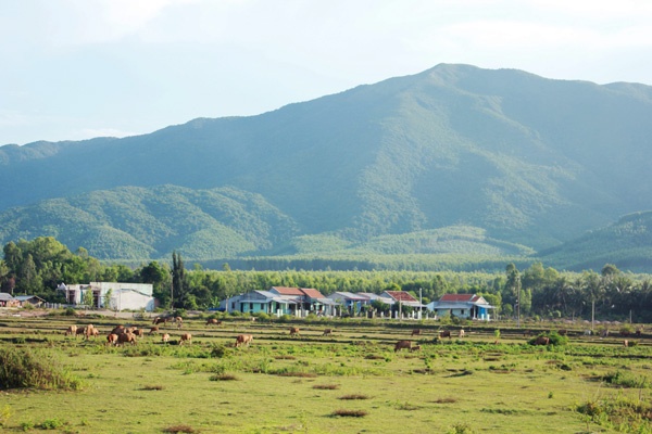 Chạy tiếp nữa là cánh đồng xanh mượt, xa xa, những mái nhà ngói đỏ đơn sơ và đàn trâu đang nhởn nhơ gặm cỏ trong khung cảnh làng quê thanh bình. Cảm giác như đi xuyên núi, xuyên rừng để về với biển. Gành đá Lộ Diêu hiện ra trước mắt, đẹp hoang sơ, kỳ vĩ.