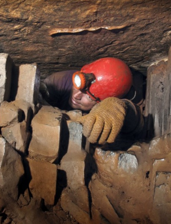 | Một thành viên đoàn đang "vật lộn" để vượt qua đoạn đường hầm. Annette, 49 tuổi, cùng đoàn thám hiểm khám phá, chụp hình mỏ khoáng sản. Annette cho hay, mỏ gần như chìm hoàn toàn trong nước. Cả đoàn thám hiểm phải làm việc trong bóng tối. Nguồn ánh sáng duy nhất là từ chiếc đèn họ đeo trên trán. Thỉnh thoảng các thành viên trong đoàn đốt đuốc. Ảnh: Telegraph. |