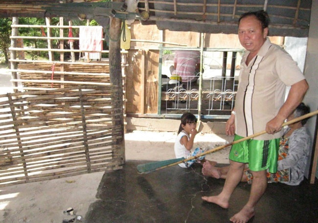 | Ông Liền đang cầm cái vợt – dụng cụ để bắt nhái. |