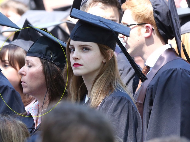 | Người phụ nữ mặc áo cử nhân đứng bên cạnh Emma Watson trong lễ tốt nghiệp thực ra là vệ sĩ của cô. |