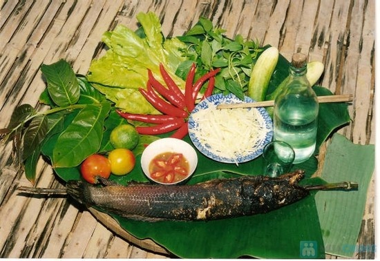 | Ẩm thực nơi đây phong phú mang vẻ đặc trưng của vùng sông nước Cửu Long: cá tai tượng chiên xù cuốn bánh tráng, cá lóc nướng trui, bánh xèo, chả giò chiên giòn,... |