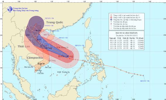 Được đánh giá là một trong những cơn bão mạnh nhất từng được ghi nhận, bão Haiyan đang trên đường tiến thẳng vào khu vực miền Trung của Việt Nam. Tính tới 13h ngày mai 10/11, sức gió ở gần vùng tâm bão mạnh cấp 13, cấp 14, tương đương 134 – 166 km/h, giật cấp 15, cấp 16. |