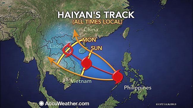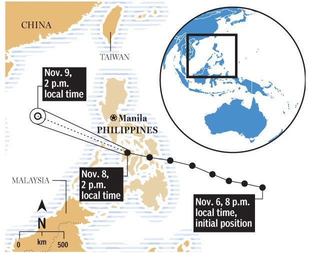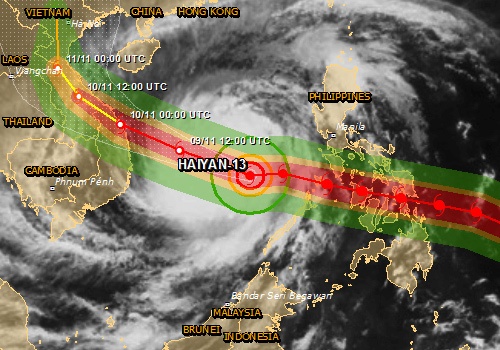 Mô phỏng đường đi của bão Haiyan trong ngày 9-10-11/11. Theo dự báo, bão Haiyan có thể đổ bộ vào Việt Nam trong ngày thứ hai, 11/11. |