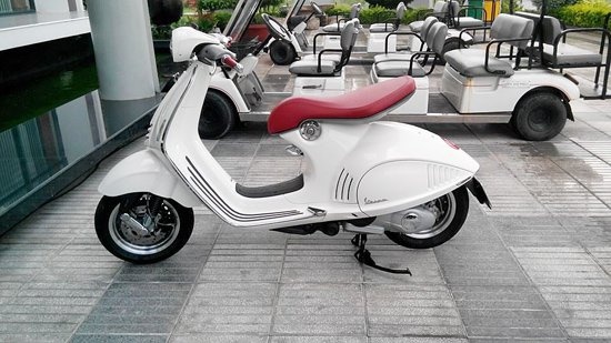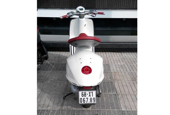 Chiếc Vespa 946 đeo biển Kiên Giang (68) được nhìn thấy dựng trong một khu nghỉ dưỡng, bên cạnh là những chiếc xe số, xe tay ga có giá trị kém hàng chục lần. Với màu trắng muốt pha đỏ từ yên xe và tay nắm điều khiển, vị trí gắn biển số càng nổi bật hơn với dãy số không đụng hàng.