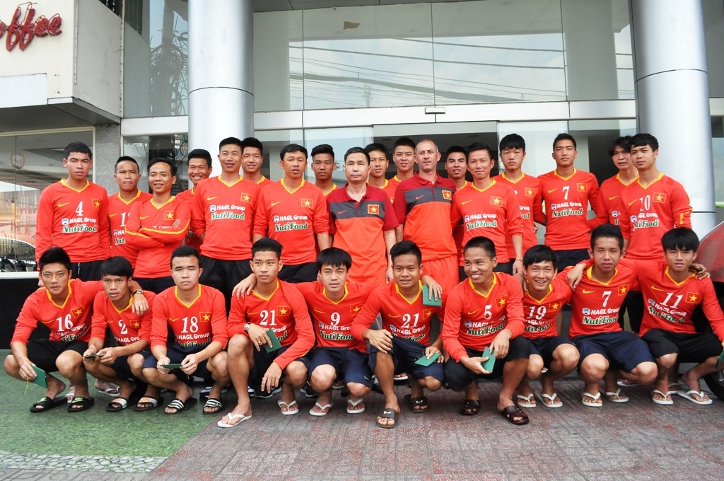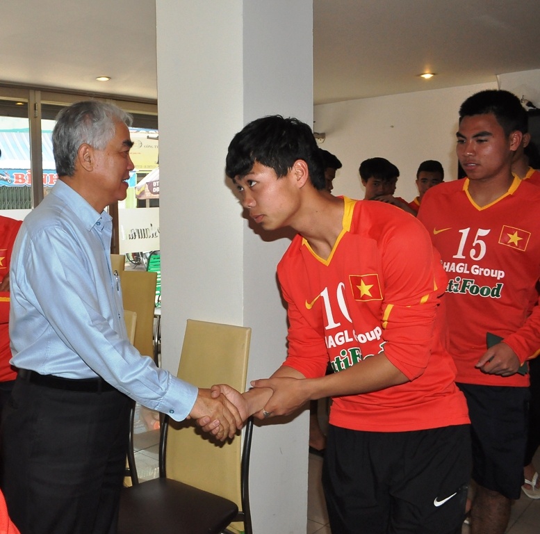 Sáng nay, quyền chủ tịch VFF Lê Hùng Dũng cùng nhà tài trợ đã đến thăm, động viên trước khi đội U19 Việt Nam sang Anh, Bỉ tập huấn trong 51 ngày.