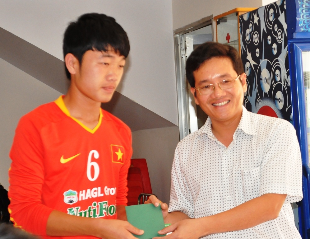 | Ông Trần Thanh Hải, đại diện nhà tài trợ tặng đội U19 Việt Nam số tiền lì xì trước khi lên đường cộng với cẩm nang về dinh dưỡng. Theo đó, mỗi thành viên trong đoàn U19 Việt Nam nhận 100 USD. |