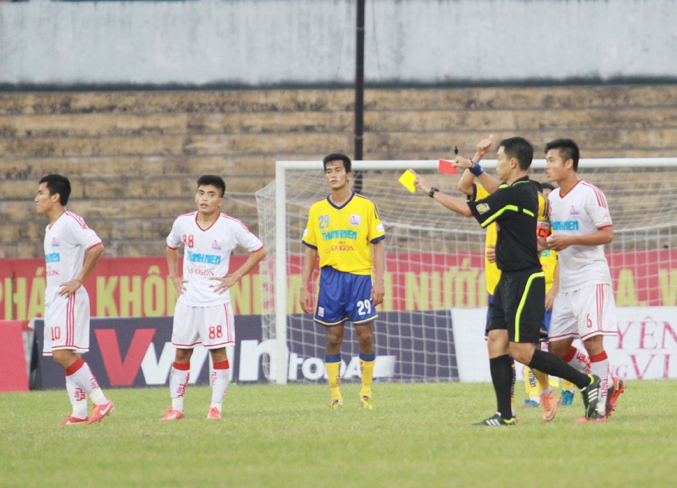 | Trọng tài Duy Lân phải rút ra 7 thẻ vàng và 1 thẻ đỏ. |