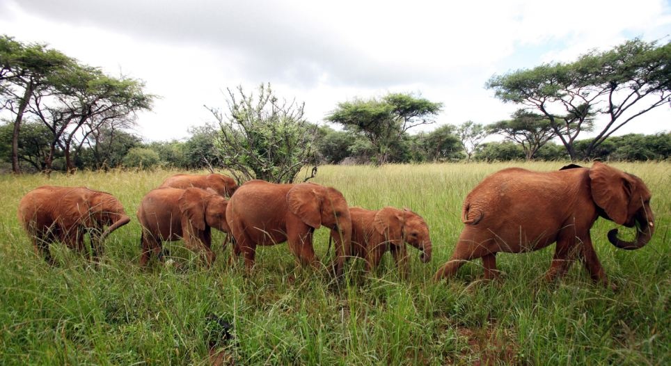 | Đàn voi mồ côi kiếm ăn trên đồng cỏ. |
