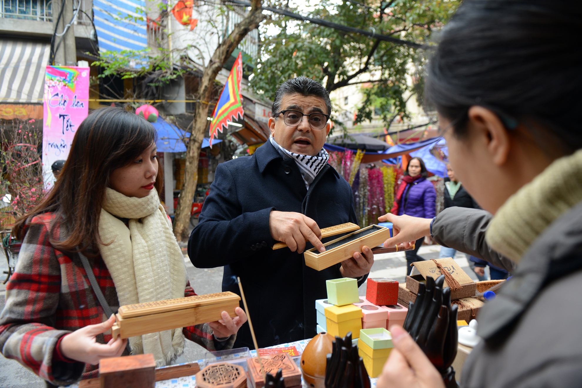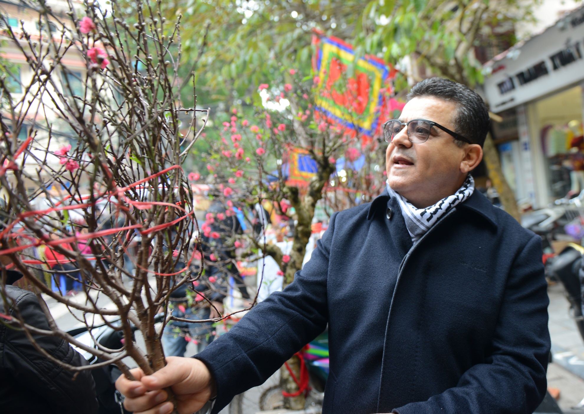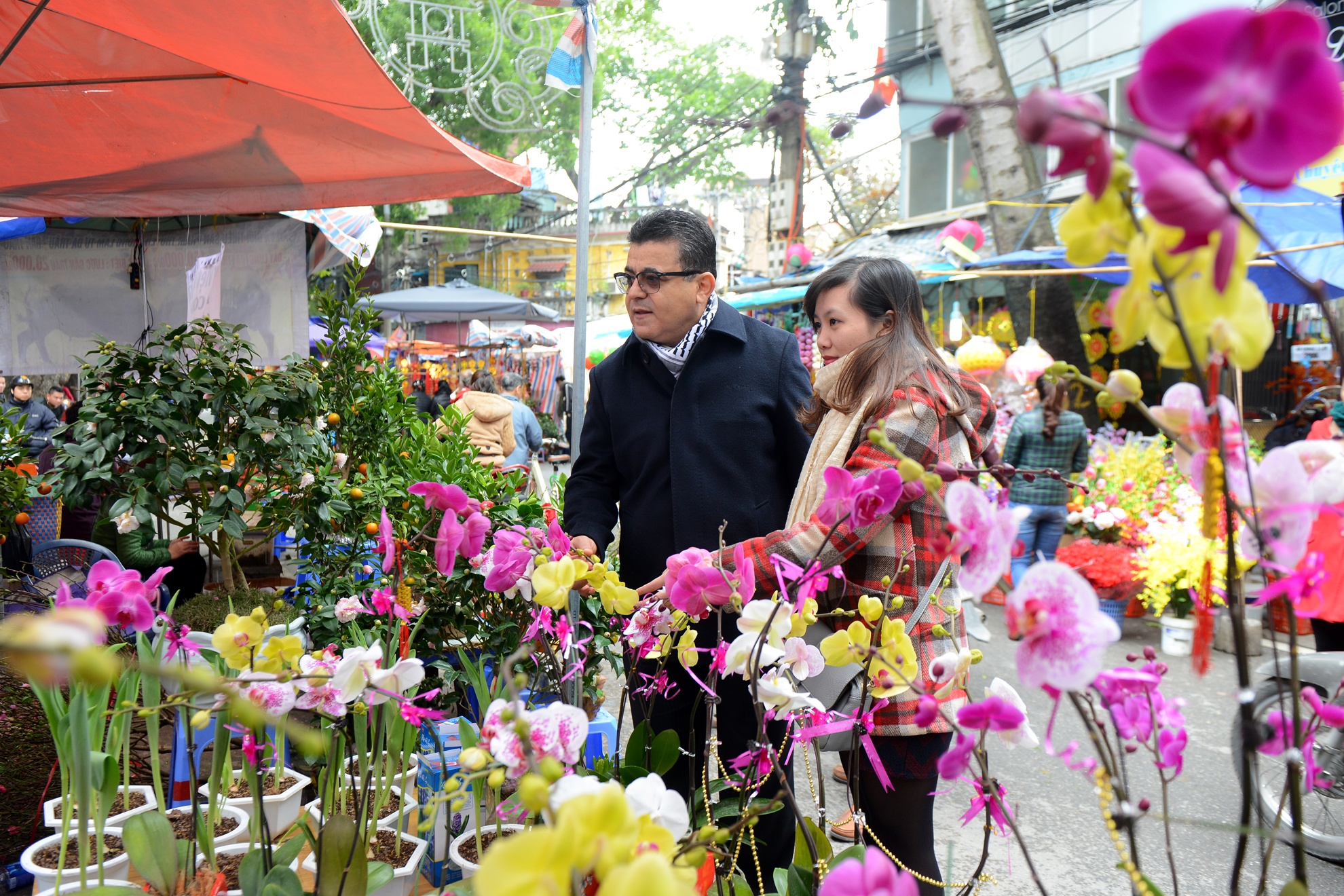 | Sau khi thả cá chép, Đại sứ ghé thăm chợ hoa Hàng Lược du xuân, sắm đào về chơi Tết. |