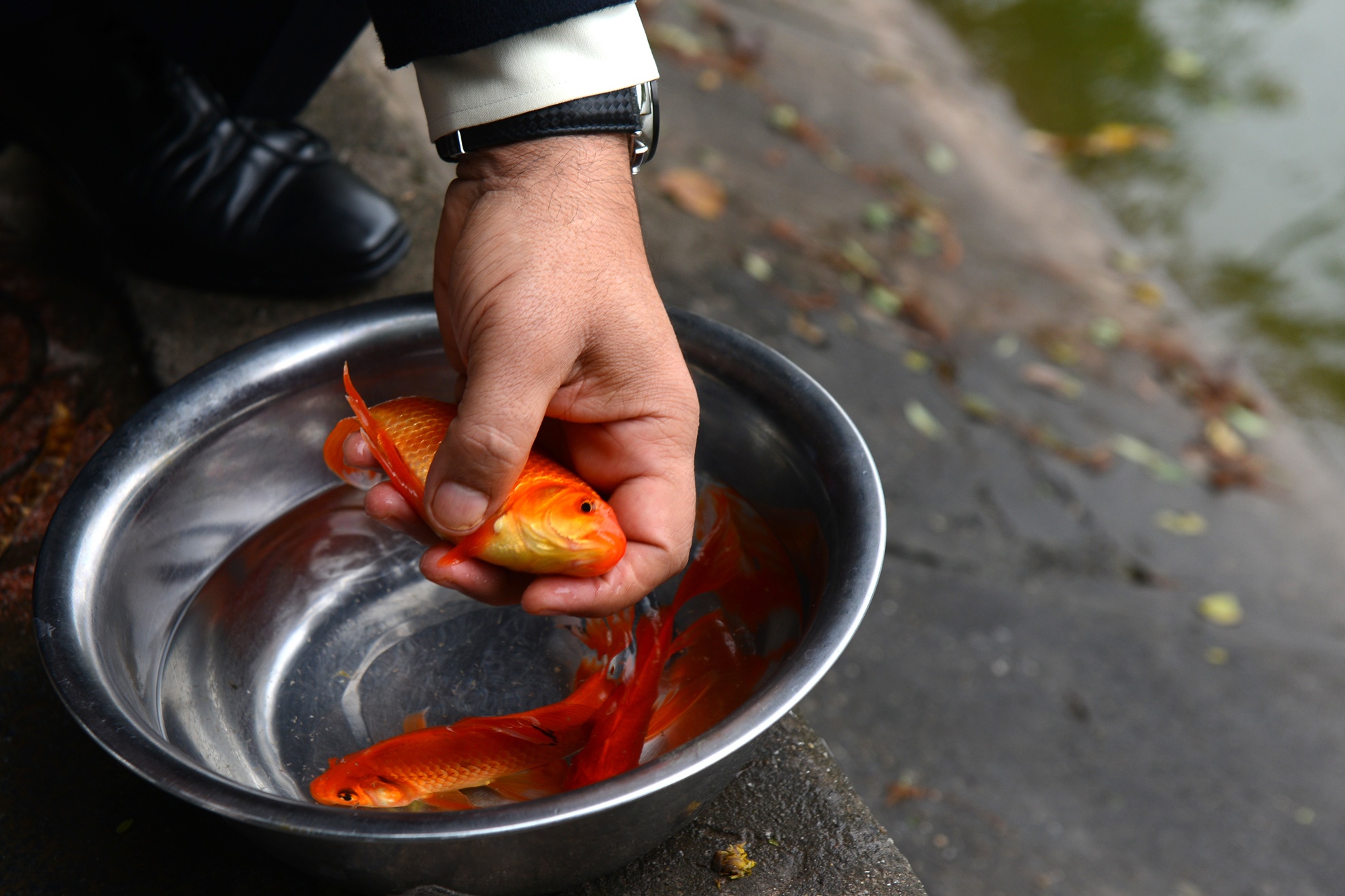 | Ông tự tay bắt từng con cá thả xuống mặt nước. Với ông, dù làm bất cứ việc gì dù nhỏ nhất cũng cần xuất phát từ tấm lòng và cái tâm của chính mình. |