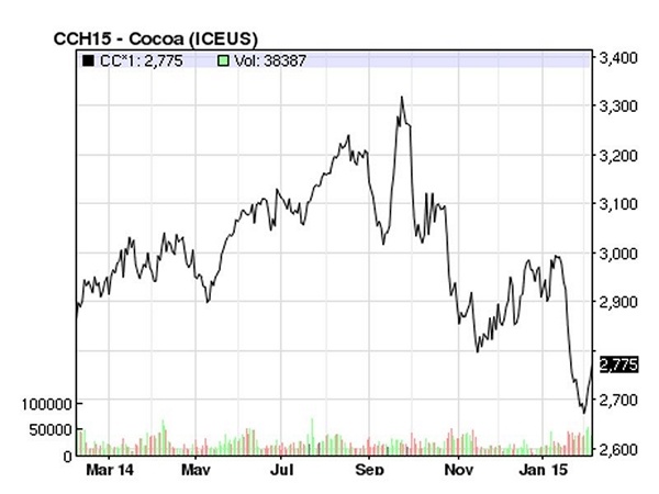 Đồ thị giá ca cao ở Mỹ kể từ ngày Valentine 2014 trông lởm chởm, rách rưới như một trái tim tan vỡ. Đặc biệt, vào cuối tháng 9/2014, giá tăng rất mạnh rồi sau đó giảm dần. Rõ ràng, nỗi lo sợ trước đợt bùng phát hai dịch bệnh nguy hiểm Ebola đã chuyển hóa vào giá ca cao, bên cạnh nhu cầu chocolate cũng yếu đi.