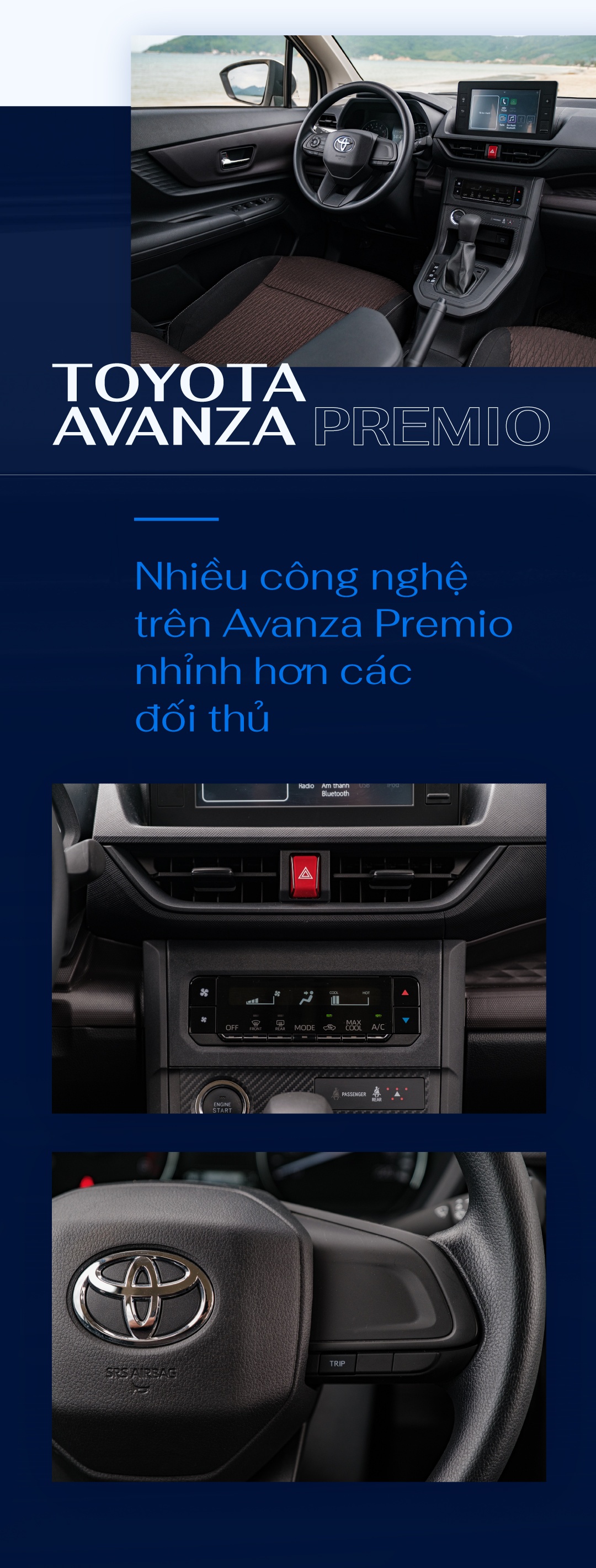 Khi nghe qua các công nghệ an toàn trên Avanza Premio, có thể bạn không quá ấn tượng. Tuy nhiên, nhiều công nghệ trên Avanza Premio nhỉnh hơn các đối thủ như cảnh báo điểm mù kết hợp cảnh báo phương tiện cắt ngang phía sau, 6 túi khí, 2 cảm biến lùi.