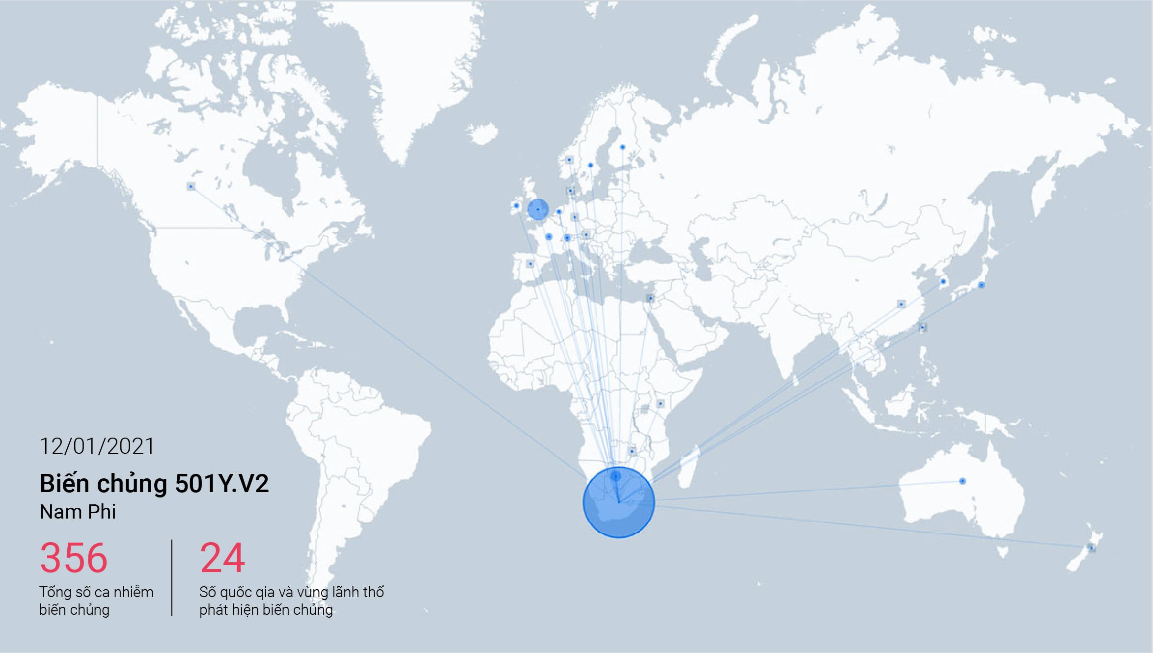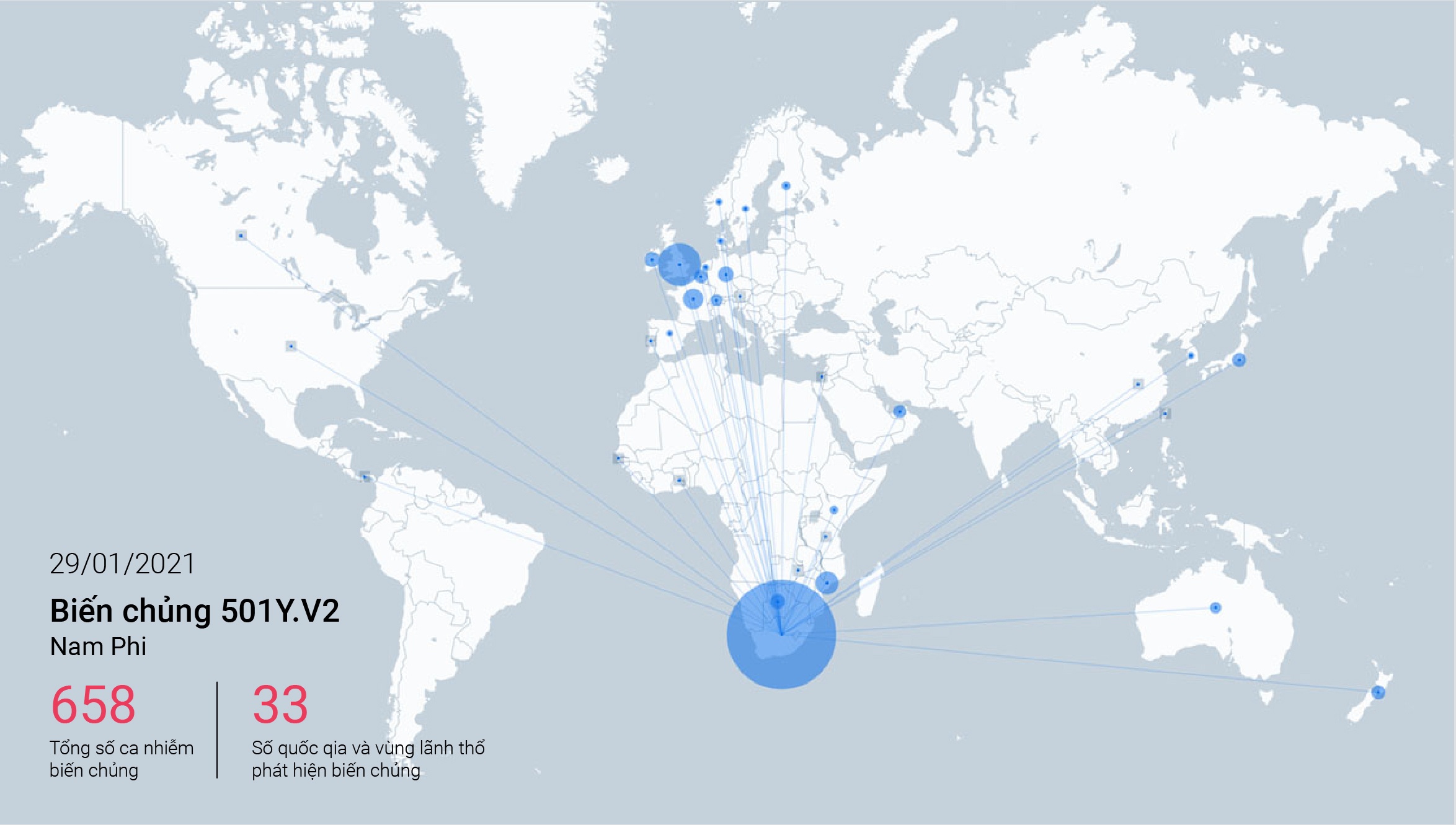 | Tốc độ phát tán của biến chủng 501Y.V2 được tìm thấy tại Nam Phi. Tính đến 29/01/2021. |