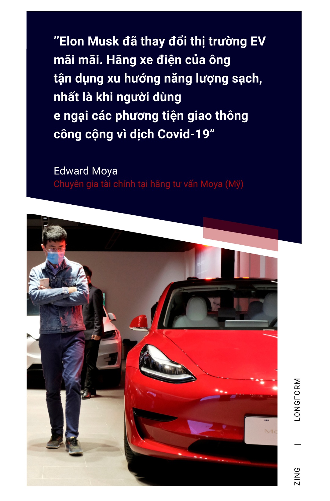 Trong cuộc phỏng vấn với Zing, chuyên gia tài chính Edward Moya tại hãng tư vấn Moya (Mỹ) nhận định tỷ phú Elon Musk đã "thay đổi thị trường EV mãi mãi". "Hãng xe điện của ông tận dụng xu hướng năng lượng sạch, nhất là khi người dùng e ngại các phương tiện giao thông công cộng vì dịch Covid-19", vị chuyên gia nói thêm.