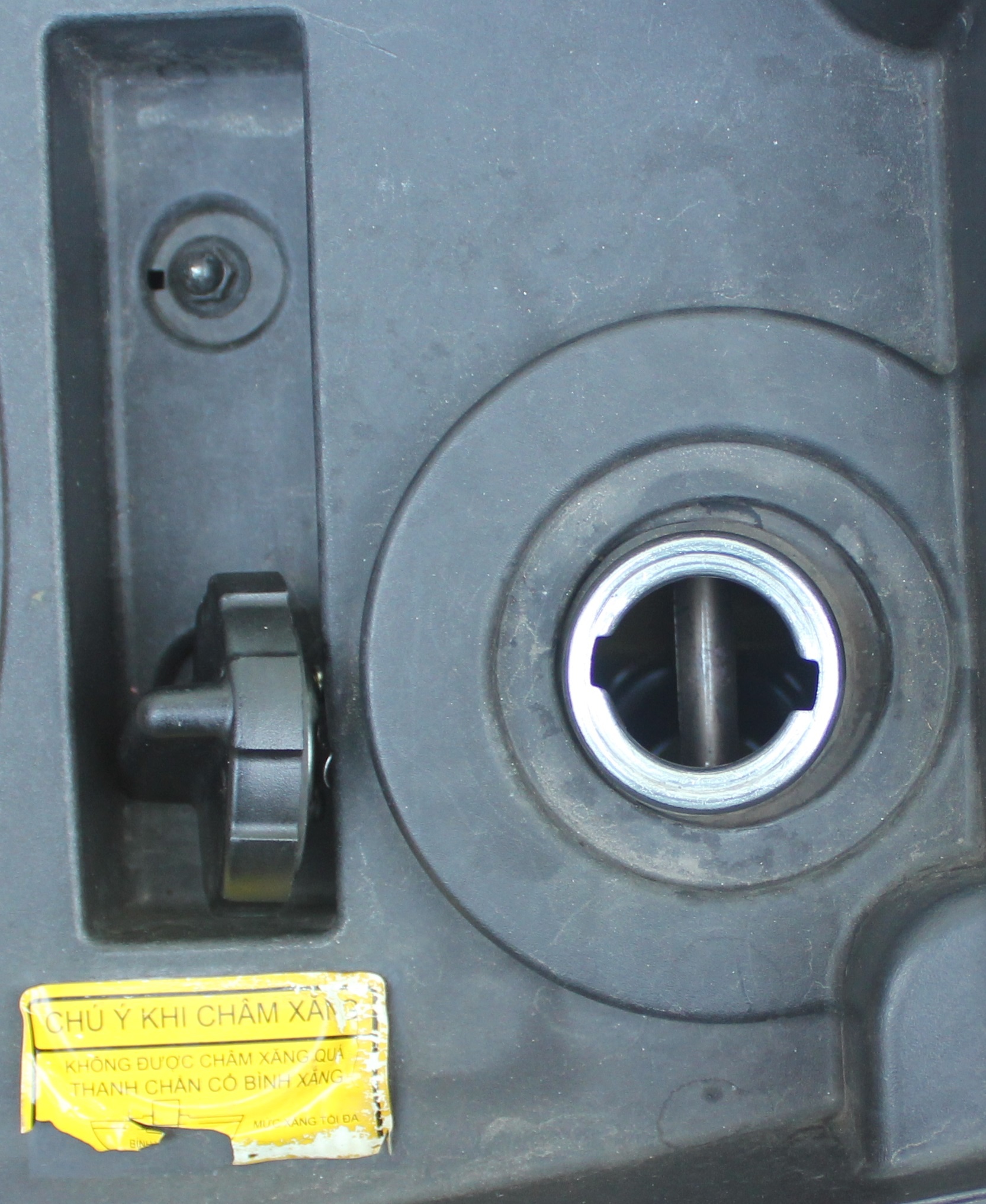 | Bình xăng xe Attila ghi cảnh báo không được đổ xăng quá thanh chắn miệng bình. Ảnh: Minh Anh. |