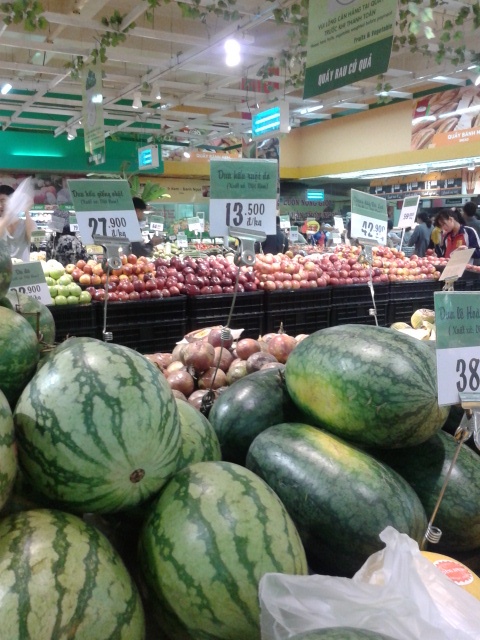 | Dưa hấu ruột đỏ tại các siêu thị vẫn duy trì mức giá từ 13.000 đồng đến 15.000 đồng/kg. Siêu thị BigC Thăng Long có áp dụng giá dưa 10.900 đồng/kg, nhưng chỉ đến hết ngày 25/3. Ảnh: Trần Anh. |