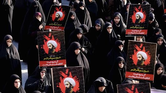 | Người Iran cầm ảnh vị giáo sĩ bị Saudi Arabia xử tử để phản đối hành động của Riyadh. Ảnh: Reuters |