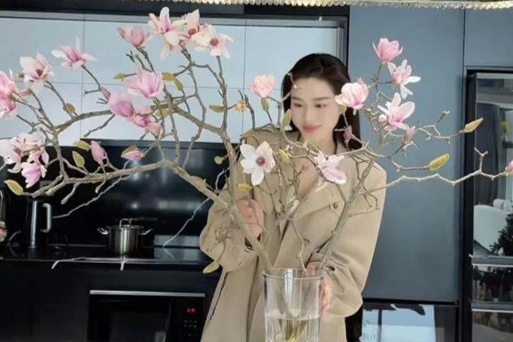 Hoa hậu Đỗ Thị Hà chăm sóc cành hoa mộc lan. Ảnh: TikTok/@doha_20.07. |