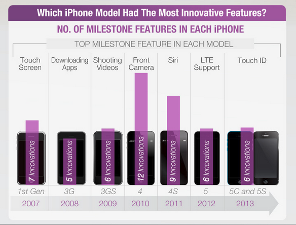 Dưới đây là thống kế về số lượng những tính năng mới có mặt trên các đời iPhone từ phiên bản đầu tiên cho đến iPhone 5S.